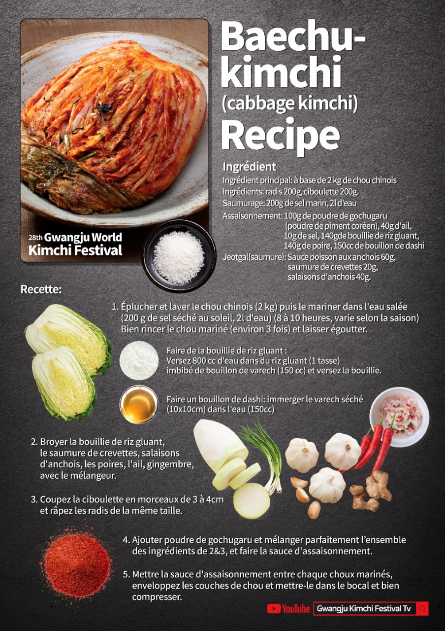 Le kimchi (김치) est un aliment traditionnel de la gastronomie coréenne. Plat de base de l’alimentation des coréens, il est indispensable à chaque repas (petit-déjeuner compris !). Le kimchi un mets préparé avec des légumes fermentés dans une sauce au piment, il est généralement composé de chou chinois, mais aussi parfois de radis.