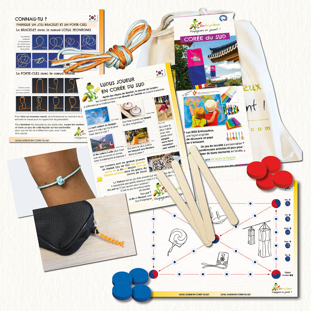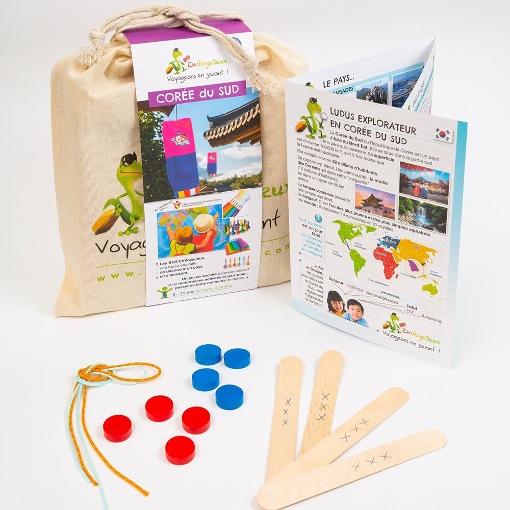 Dans notre Box Corée du Sud, les enfants entre 6 et 11 ans découvrent la Corée du Sud sous toutes ses facettes avec des livrets, une fiche d’initiation à l’hangeul, un jeu de Yut Nori à personnaliser, une initiation au maedeup, des jeux de logique, d’observation et de mots, des coloriages….