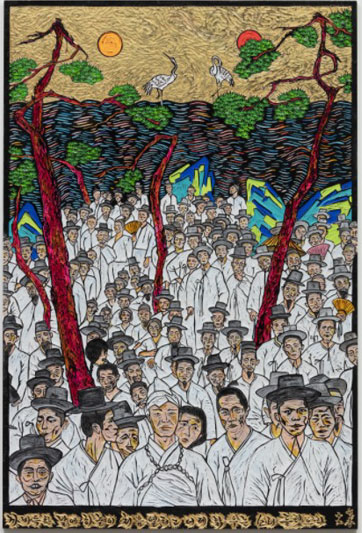 l’étude des racines des idéologies Orientales et Occidentales et l’ampleur de ses réflexions sur le phénomène de culture moderne coréen se révèlent dans d’innombrable allusions philosophiques et littéraires présents dans sa collection de peintures sur bois gravé. La gravure sur bois peinte est une forme unique de gravure du bois, du fait que celui-ci est gravé non pas pour réaliser des impressions comme le voudrait son usage traditionnel mais pour être peint et encré en tant qu’oeuvre d’art finale.
